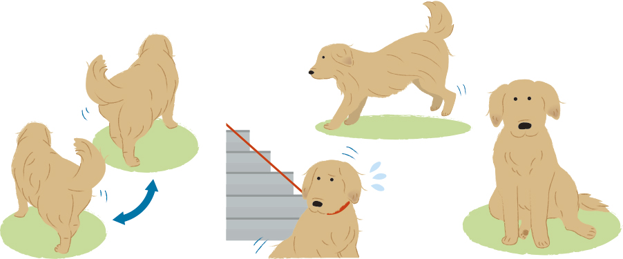 - 後ろ肢の動きが不自由そうに見える、フラフラと不自然な歩き方をする