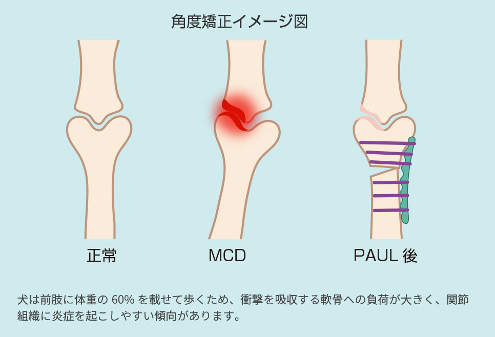 PAUL(Proximal Ulnar Osteotomy) は中型犬・大型犬の肘関節内側軟骨損傷(MCD)に対して行う手術です。肘関節内側軟骨損傷とは、本来なら内側と外側に均等にかかるべき荷重が、成長期の肘関節の形成不全などにより不安定な状態が続くことで内側に偏り、軟骨がすり減っていくことで痛み・消失を引き起こす疾患です。