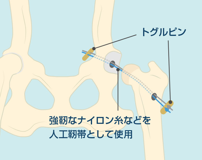 トグルピン法とは、股関節形成不全などのない、外傷性股関節脱臼に対して適応される整復手術の術式です。トグルピンと呼ばれる専用インプラントをアンカーのように機能させ、手術用ナイロン糸を用いて大腿骨と寛骨臼をつなぎとめて安定化を図ります。骨切りの必要がなく、自骨と関節構造を温存でき、他の術式に比べて侵襲が少ないので、特別なリハビリが必要なく機能回復も早いというメリットがあります。